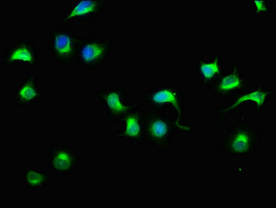 Immunofluorescence staining of A549 cells with CSB-PA725567LA01HU at 1:33, counter-stained with DAPI. The cells were fixed in 4% formaldehyde, permeabilized using 0.2% Triton X-100 and blocked in 10% normal Goat Serum. The cells were then incubated with the antibody overnight at 4°C. The secondary antibody was Alexa Fluor 488-congugated AffiniPure Goat Anti-Rabbit IgG(H+L).