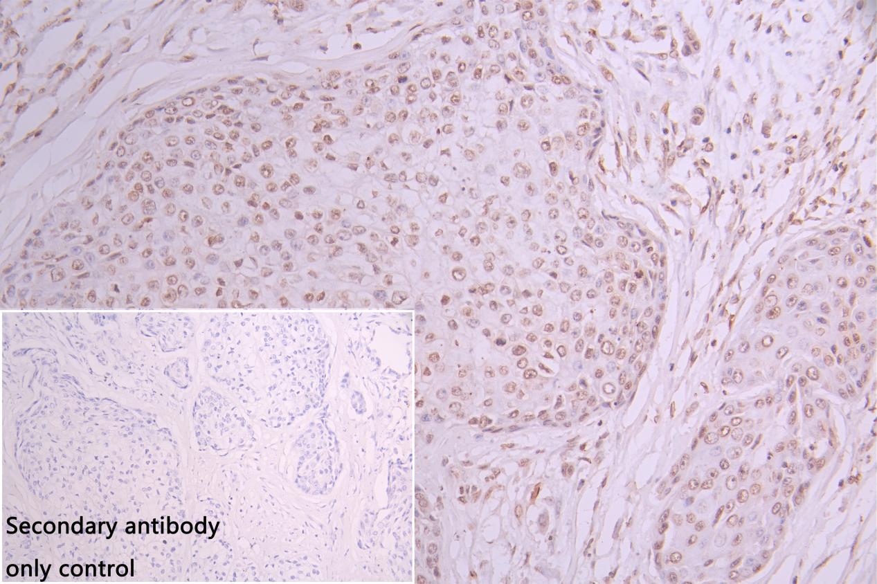 IHCimageofCSB-PA010289ESR1HUdilutedat1:30andstaininginparaffin-embeddedhumancolorectalcancerperformedonaLeicaBondTMsystem.Afterdewaxingandhydration,antigenretrievalwasmediatedbyhighpressureinacitratebuffer(pH6.0).Sectionwasblockedwith10%normalgoatserum30minatRT.Thenprimaryantibody(1%BSA)wasincubatedat4°Covernight.TheprimaryisdetectedbyaGoatanti-rabbitpolymerIgGlabeledbyHRPandvisualizedusing0.05%DAB. Secondaryantibodyonlycontrol: uses 1%BSA instead of primary antibody