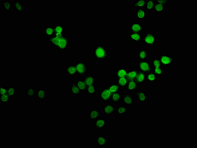Immunofluorescence staining of PC-3 cells with CSB-PA897496LA01HU at 1:66, counter-stained with DAPI. The cells were fixed in 4% formaldehyde, permeabilized using 0.2% Triton X-100 and blocked in 10% normal Goat Serum. The cells were then incubated with the antibody overnight at 4°C. The secondary antibody was Alexa Fluor 488-congugated AffiniPure Goat Anti-Rabbit IgG(H+L).