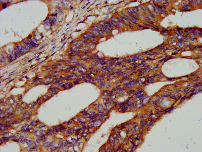 IHC image of CSB-PA010316LA01HU diluted at 1:300 and staining in paraffin-embedded human colon cancer performed on a Leica BondTM system. After dewaxing and hydration, antigen retrieval was mediated by high pressure in a citrate buffer (pH 6.0). Section was blocked with 10% normal goat serum 30min at RT. Then primary antibody (1% BSA) was incubated at 4°C overnight. The primary is detected by a biotinylated secondary antibody and visualized using an HRP conjugated SP system.