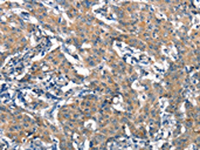 The image on the left is immunohistochemistry of paraffin-embedded Human gastric cancer tissue using CSB-PA254609(HGF Antibody) at dilution 1/65, on the right is treated with fusion protein. (Original magnification: ×200)