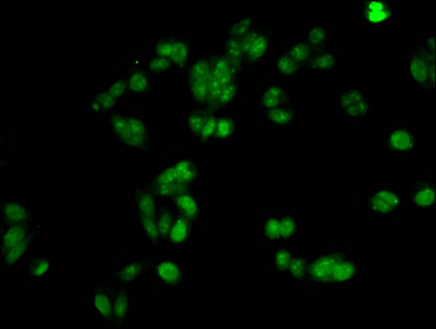 Immunofluorescent analysis of HepG2 cells using CSB-PA010376PA21nacHU at dilution of 1:100 and Alexa Fluor 488-congugated AffiniPure Goat Anti-Rabbit IgG(H+L)