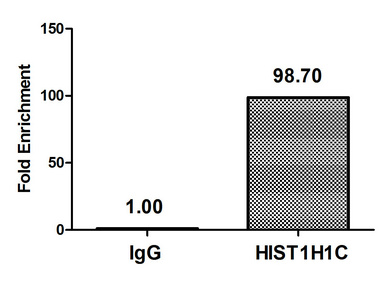 Chromatin Immunoprecipitation Hela (4*106) were treated with Micrococcal Nuclease, sonicated, and immunoprecipitated with 8µg anti-HIST1H1C (CSB-PA010378PA16nacHU) or a control normal rabbit IgG. The resulting ChIP DNA was quantified using real-time PCR with primers against the β-Globin promoter.