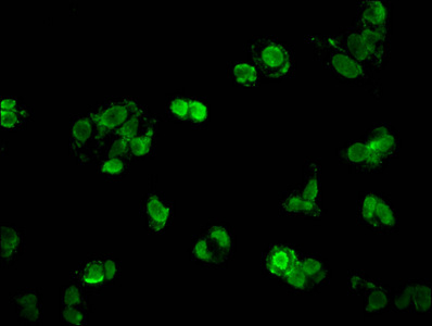 Immunofluorescent analysis of HepG2 cells using CSB-PA010378PA16nacHU at dilution of 1:100 and Alexa Fluor 488-congugated AffiniPure Goat Anti-Rabbit IgG(H+L)
