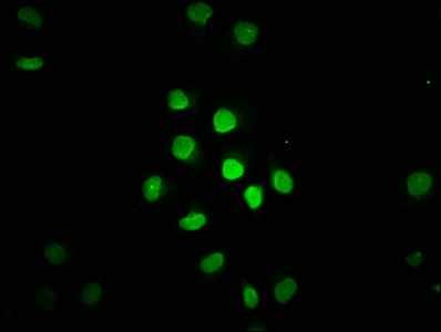 Immunofluorescence staining of A549 cells with CSB-PA010378OA96ncrHU at 1:2, counter-stained with DAPI. The cells were fixed in 4% formaldehyde, permeabilized using 0.2% Triton X-100 and blocked in 10% normal Goat Serum. The cells were then incubated with the antibody overnight at 4°C. The secondary antibody was Alexa Fluor 488-congugated AffiniPure Goat Anti-Rabbit IgG(H+L).