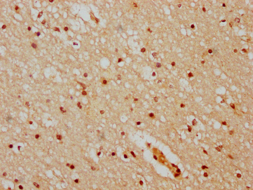 IHC image of CSB-PA010378OA51nhibHU diluted at 1:20 and staining in paraffin-embedded human brain tissue performed on a Leica BondTM system. After dewaxing and hydration, antigen retrieval was mediated by high pressure in a citrate buffer (pH 6.0). Section was blocked with 10% normal goat serum 30min at RT. Then primary antibody (1% BSA) was incubated at 4°C overnight. The primary is detected by a biotinylated secondary antibody and visualized using an HRP conjugated SP system.