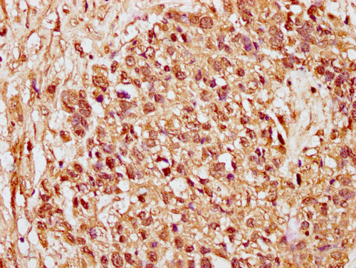 IHC image of CSB-PA010378PA89nacHU diluted at 1:15 and staining in paraffin-embedded human ovarian cancer performed on a Leica BondTM system. After dewaxing and hydration, antigen retrieval was mediated by high pressure in a citrate buffer (pH 6.0). Section was blocked with 10% normal goat serum 30min at RT. Then primary antibody (1% BSA) was incubated at 4°C overnight. The primary is detected by a biotinylated secondary antibody and visualized using an HRP conjugated SP system.