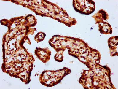 IHC image of CSB-PA010379OA64nbhbHU diluted at 1:20 and staining in paraffin-embedded human placenta tissue performed on a Leica BondTM system. After dewaxing and hydration, antigen retrieval was mediated by high pressure in a citrate buffer (pH 6.0). Section was blocked with 10% normal goat serum 30min at RT. Then primary antibody (1% BSA) was incubated at 4°C overnight. The primary is detected by a biotinylated secondary antibody and visualized using an HRP conjugated SP system.