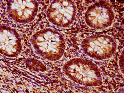 IHC image of CSB-PA010379OA64nbhbHU diluted at 1:20 and staining in paraffin-embedded human appendix tissue performed on a Leica BondTM system. After dewaxing and hydration, antigen retrieval was mediated by high pressure in a citrate buffer (pH 6.0). Section was blocked with 10% normal goat serum 30min at RT. Then primary antibody (1% BSA) was incubated at 4°C overnight. The primary is detected by a biotinylated secondary antibody and visualized using an HRP conjugated SP system.