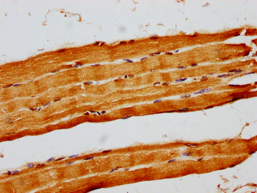 IHC image of CSB-PA010379OA140nforHU diluted at 1:14 and staining in paraffin-embedded human skeletal muscle tissue performed on a Leica BondTM system. After dewaxing and hydration, antigen retrieval was mediated by high pressure in a citrate buffer (pH 6.0). Section was blocked with 10% normal goat serum 30min at RT. Then primary antibody (1% BSA) was incubated at 4°C overnight. The primary is detected by a biotinylated secondary antibody and visualized using an HRP conjugated SP system.