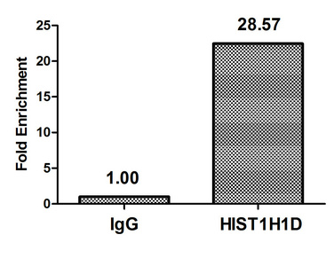 Chromatin Immunoprecipitation Hela (4*106) were treated with Micrococcal Nuclease, sonicated, and immunoprecipitated with 5μg anti-HIST1H1D (CSB-PA010379OA179nphHU) or a control normal rabbit IgG. The resulting ChIP DNA was quantified using real-time PCR with primers against the β-Globin promoter.