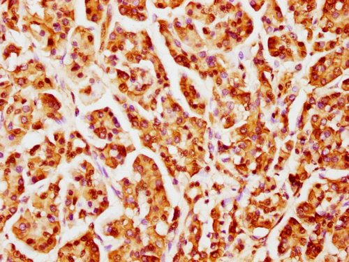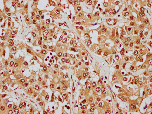 IHC image of CSB-PA010380OA26nphHU diluted at 1:8 and staining in paraffin-embedded human liver cancer performed on a Leica BondTM system. After dewaxing and hydration, antigen retrieval was mediated by high pressure in a citrate buffer (pH 6.0). Section was blocked with 10% normal goat serum 30min at RT. Then primary antibody (1% BSA) was incubated at 4°C overnight. The primary is detected by a biotinylated secondary antibody and visualized using an HRP conjugated SP system.