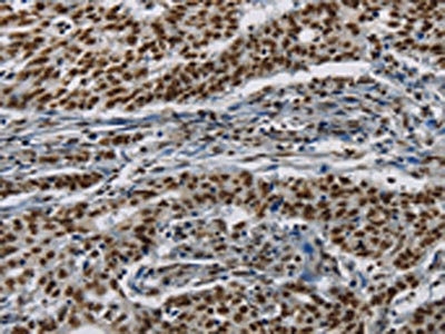 The image on the left is immunohistochemistry of paraffin-embedded Human gastic cancer tissue using CSB-PA781258(HIST1H2AB Antibody) at dilution 1/20, on the right is treated with synthetic peptide. (Original magnification: ×200)