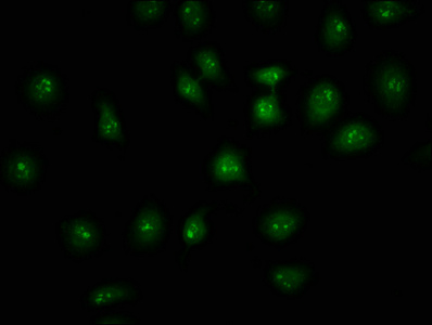Immunofluorescence staining of A549 cells with CSB-PA846293LA01HU at 1:133, counter-stained with DAPI. The cells were fixed in 4% formaldehyde, permeabilized using 0.2% Triton X-100 and blocked in 10% normal Goat Serum. The cells were then incubated with the antibody overnight at 4°C. The secondary antibody was Alexa Fluor 488-congugated AffiniPure Goat Anti-Rabbit IgG(H+L).