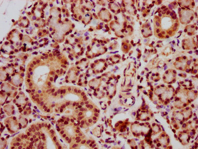 IHC image of CSB-PA010389OA118nhibHU diluted at 1:20 and staining in paraffin-embedded human pancreatic tissue performed on a Leica BondTM system. After dewaxing and hydration, antigen retrieval was mediated by high pressure in a citrate buffer (pH 6.0). Section was blocked with 10% normal goat serum 30min at RT. Then primary antibody (1% BSA) was incubated at 4°C overnight. The primary is detected by a biotinylated secondary antibody and visualized using an HRP conjugated SP system.