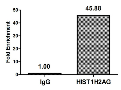 Chromatin Immunoprecipitation Hela (4*106) were treated with Micrococcal Nuclease, sonicated, and immunoprecipitated with 5µg anti-HIST1H2AG (CSB-PA010389OA118nhibHU) or a control normal rabbit IgG. The resulting ChIP DNA was quantified using real-time PCR with primers against the β-Globin promoter.