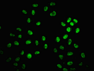 Immunofluorescence staining of Hela cells with CSB-PA010389OA29nme2HU at 1:1, counter-stained with DAPI. The cells were fixed in 4% formaldehyde, permeabilized using 0.2% Triton X-100 and blocked in 10% normal Goat Serum. The cells were then incubated with the antibody overnight at 4°C. The secondary antibody was Alexa Fluor 488-congugated AffiniPure Goat Anti-Rabbit IgG(H+L).