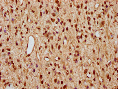 IHC image of CSB-PA010389OA29nme2HU diluted at 1:10 and staining in paraffin-embedded human glioma performed on a Leica BondTM system. After dewaxing and hydration, antigen retrieval was mediated by high pressure in a citrate buffer (pH 6.0). Section was blocked with 10% normal goat serum 30min at RT. Then primary antibody (1% BSA) was incubated at 4°C overnight. The primary is detected by a biotinylated secondary antibody and visualized using an HRP conjugated SP system.