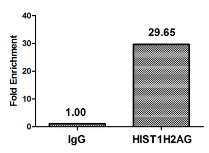 Chromatin Immunoprecipitation Hela (4*106) were treated with Micrococcal Nuclease, sonicated, and immunoprecipitated with 5µg anti-HIST1H2AG (CSB-PA010389PA119ncrHU) or a control normal rabbit IgG. The resulting ChIP DNA was quantified using real-time PCR with primers against the β-Globin promoter.