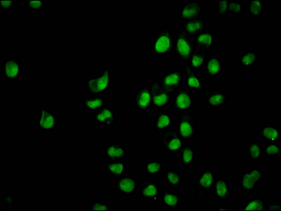 Immunofluorescence staining of Hela cells with CSB-PA010403OA20nbutHU at 1:1, counter-stained with DAPI. The cells were fixed in 4% formaldehyde, permeabilized using 0.2% Triton X-100 and blocked in 10% normal Goat Serum. The cells were then incubated with the antibody overnight at 4°C. The secondary antibody was Alexa Fluor 488-congugated AffiniPure Goat Anti-Rabbit IgG(H+L).