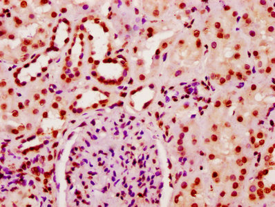 IHC image of CSB-PA010403OA20nbutHU diluted at 1:10 and staining in paraffin-embedded human kidney tissue performed on a Leica BondTM system. After dewaxing and hydration, antigen retrieval was mediated by high pressure in a citrate buffer (pH 6.0). Section was blocked with 10% normal goat serum 30min at RT. Then primary antibody (1% BSA) was incubated at 4°C overnight. The primary is detected by a biotinylated secondary antibody and visualized using an HRP conjugated SP system.