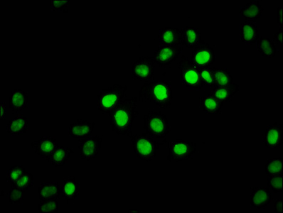 Immunofluorescence staining of Hela cells with CSB-PA010403OA34nbhbHU at 1:1, counter-stained with DAPI. The cells were fixed in 4% formaldehyde, permeabilized using 0.2% Triton X-100 and blocked in 10% normal Goat Serum. The cells were then incubated with the antibody overnight at 4°C. The secondary antibody was Alexa Fluor 488-congugated AffiniPure Goat Anti-Rabbit IgG(H+L).