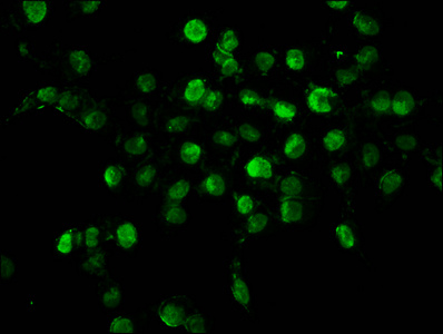 Immunofluorescence staining of Hela cells with CSB-PA010403OA34nhibHU at 1:1, counter-stained with DAPI. The cells were fixed in 4% formaldehyde, permeabilized using 0.2% Triton X-100 and blocked in 10% normal Goat Serum. The cells were then incubated with the antibody overnight at 4°C. The secondary antibody was Alexa Fluor 488-congugated AffiniPure Goat Anti-Rabbit IgG(H+L).