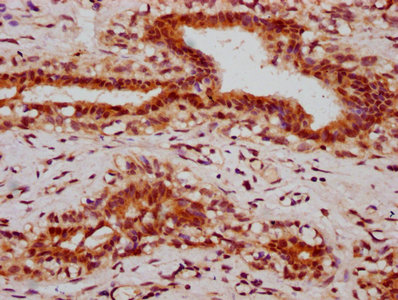 IHC image of CSB-PA010403OA05ngluHU diluted at 1:10 and staining in paraffin-embedded human breast cancer performed on a Leica BondTM system. After dewaxing and hydration, antigen retrieval was mediated by high pressure in a citrate buffer (pH 6.0). Section was blocked with 10% normal goat serum 30min at RT. Then primary antibody (1% BSA) was incubated at 4°C overnight. The primary is detected by a biotinylated secondary antibody and visualized using an HRP conjugated SP system.