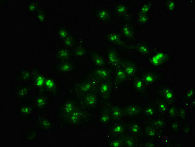 Immunofluorescence staining of Hela cells with CSB-PA010403OA05ngluHU at 1:1, counter-stained with DAPI. The cells were fixed in 4% formaldehyde, permeabilized using 0.2% Triton X-100 and blocked in 10% normal Goat Serum. The cells were then incubated with the antibody overnight at 4°C. The secondary antibody was Alexa Fluor 488-congugated AffiniPure Goat Anti-Rabbit IgG(H+L).