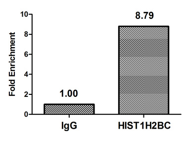 Chromatin Immunoprecipitation Hela (4*106) were treated with Micrococcal Nuclease, sonicated, and immunoprecipitated with 5µg anti-HIST1H2BC (CSB-PA010403OA120nforHU) or a control normal rabbit IgG. The resulting ChIP DNA was quantified using real-time PCR with primers against the β-Globin promoter.