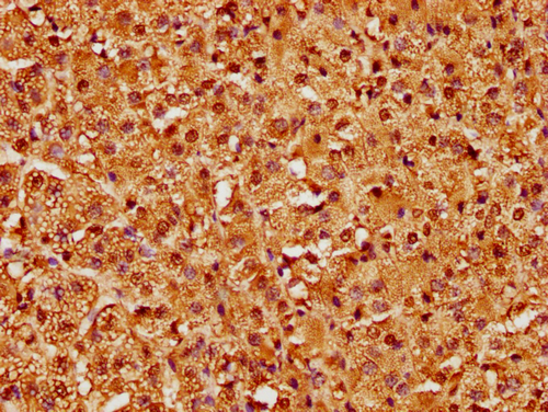 IHC image of CSB-PA010403PA15nme1HU diluted at 1:10 and staining in paraffin-embedded human colon cancer performed on a Leica BondTM system. After dewaxing and hydration, antigen retrieval was mediated by high pressure in a citrate buffer (pH 6.0). Section was blocked with 10% normal goat serum 30min at RT. Then primary antibody (1% BSA) was incubated at 4°C overnight. The primary is detected by a biotinylated secondary antibody and visualized using an HRP conjugated SP system.