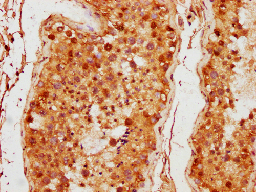 IHC image of CSB-PA010403PA57nhibHU diluted at 1:5 and staining in paraffin-embedded human testis tissue performed on a Leica BondTM system. After dewaxing and hydration, antigen retrieval was mediated by high pressure in a citrate buffer (pH 6.0). Section was blocked with 10% normal goat serum 30min at RT. Then primary antibody (1% BSA) was incubated at 4°C overnight. The primary is detected by a biotinylated secondary antibody and visualized using an HRP conjugated SP system.