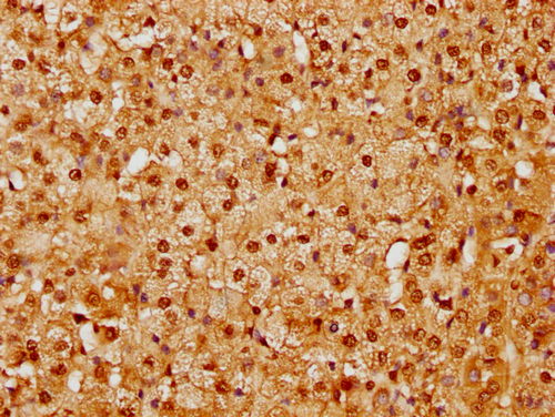 IHC image of CSB-PA010403PA79nme1HU diluted at 1:5 and staining in paraffin-embedded human colon cancer performed on a Leica BondTM system. After dewaxing and hydration, antigen retrieval was mediated by high pressure in a citrate buffer (pH 6.0). Section was blocked with 10% normal goat serum 30min at RT. Then primary antibody (1% BSA) was incubated at 4°C overnight. The primary is detected by a biotinylated secondary antibody and visualized using an HRP conjugated SP system.