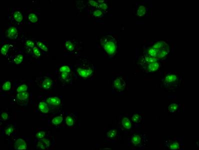 Immunofluorescence staining of MCF-7 cells with CSB-PA010418OA14nhibHU at 1:2.5, counter-stained with DAPI. The cells were fixed in 4% formaldehyde, permeabilized using 0.2% Triton X-100 and blocked in 10% normal Goat Serum. The cells were then incubated with the antibody overnight at 4°C. The secondary antibody was Alexa Fluor 488-congugated AffiniPure Goat Anti-Rabbit IgG(H+L).