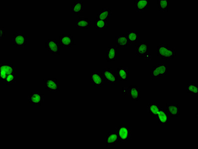 Immunofluorescent analysis of Hela cells using CSB-PA010418PA23nacHU at dilution of 1:100 and Alexa Fluor 488-congugated AffiniPure Goat Anti-Rabbit IgG(H+L)
