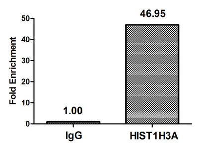 Chromatin Immunoprecipitation Hela (4*106) were treated with Micrococcal Nuclease, sonicated, and immunoprecipitated with 5µg anti-HIST1H3A (CSB-PA010418OA23nbutHU) or a control normal rabbit IgG. The resulting ChIP DNA was quantified using real-time PCR with primers against the β-Globin promoter.