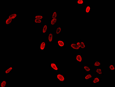 Immunofluorescent analysis of Hela cells using CSB-PA010418OA36nme2HU at dilution of 1:100 and Cy3-congugated Goat Anti-Rabbit IgG