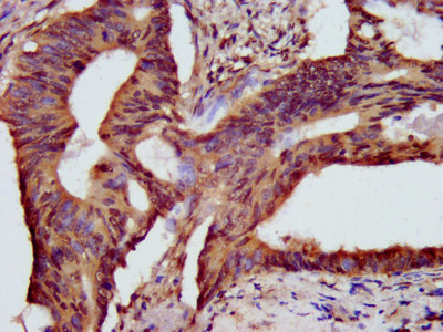 IHC image of CSB-PA010418OA56nhibHU diluted at 1: 10 and staining in paraffin-embedded human colon cancer performed on a Leica BondTM system. After dewaxing and hydration, antigen retrieval was mediated by high pressure in a citrate buffer (pH 6.0). Section was blocked with 10% normal goat serum 30min at RT. Then primary antibody (1% BSA) was incubated at 4°C overnight. The primary is detected by a biotinylated secondary antibody and visualized using an HRP conjugated SP system.