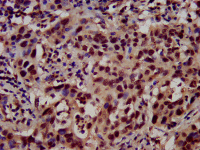IHC image of CSB-PA010418OA64nacHU diluted at 1:100 and staining in paraffin-embedded human bladder cancer performed on a Leica BondTM system. After dewaxing and hydration, antigen retrieval was mediated by high pressure in a citrate buffer (pH 6.0). Section was blocked with 10% normal goat serum 30min at RT. Then primary antibody (1% BSA) was incubated at 4°C overnight. The primary is detected by a biotinylated secondary antibody and visualized using an HRP conjugated SP system.