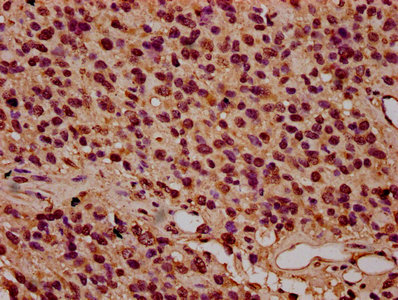IHC image of CSB-PA010418OA79nbhbHU diluted at 1:8 and staining in paraffin-embedded human glioma performed on a Leica BondTM system. After dewaxing and hydration, antigen retrieval was mediated by high pressure in a citrate buffer (pH 6.0). Section was blocked with 10% normal goat serum 30min at RT. Then primary antibody (1% BSA) was incubated at 4°C overnight. The primary is detected by a biotinylated secondary antibody and visualized using an HRP conjugated SP system.