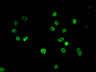 Immunofluorescent analysis of Hela cells using CSB-PA010418PA04nme2HU at dilution of 1:100 and Alexa Fluor 488-congugated AffiniPure Goat Anti-Rabbit IgG(H+L)