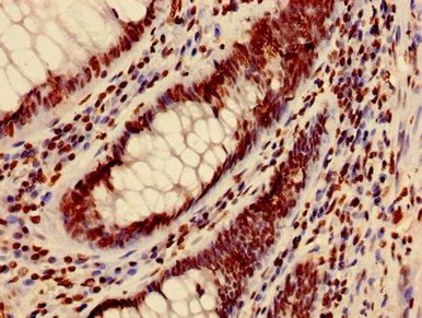 Immunohistochemistry of paraffin-embedded human colon cancer using CSB-PA010418PA04nme2HU at dilution of 1:100