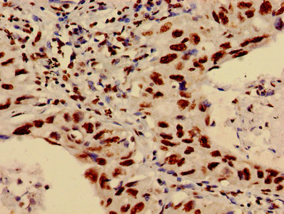 Immunohistochemistry of paraffin-embedded human lung cancer using CSB-PA010418PA04nme2HU at dilution of 1:100