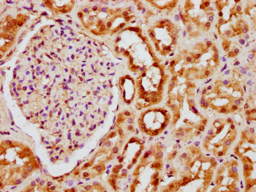 IHC image of CSB-PA010418PA56nsucHU diluted at 1:20 and staining in paraffin-embedded human kidney tissue performed on a Leica BondTM system. After dewaxing and hydration, antigen retrieval was mediated by high pressure in a citrate buffer (pH 6.0). Section was blocked with 10% normal goat serum 30min at RT. Then primary antibody (1% BSA) was incubated at 4°C overnight. The primary is detected by a biotinylated secondary antibody and visualized using an HRP conjugated SP system.