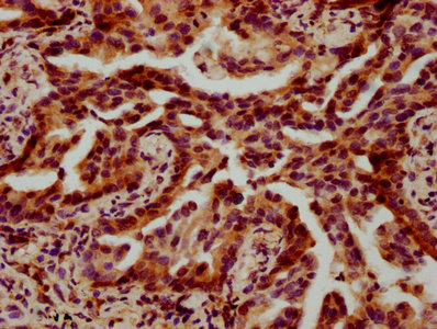 IHC image of CSB-PA010429OA44nbutHU diluted at 1:15 and staining in paraffin-embedded human lung cancer performed on a Leica BondTM system. After dewaxing and hydration, antigen retrieval was mediated by high pressure in a citrate buffer (pH 6.0). Section was blocked with 10% normal goat serum 30min at RT. Then primary antibody (1% BSA) was incubated at 4°C overnight. The primary is detected by a biotinylated secondary antibody and visualized using an HRP conjugated SP system.