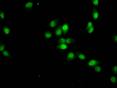 Immunofluorescence staining of Hela cells with CSB-PA010429OA88nohHU at 1:1, counter-stained with DAPI. The cells were fixed in 4% formaldehyde, permeabilized using 0.2% Triton X-100 and blocked in 10% normal Goat Serum. The cells were then incubated with the antibody overnight at 4°C. The secondary antibody was Alexa Fluor 488-congugated AffiniPure Goat Anti-Rabbit IgG(H+L).