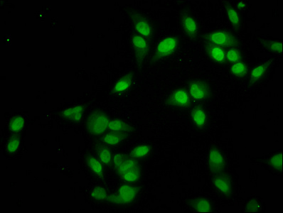 Immunofluorescence staining of Hela cells with CSB-PA010429OA91nacHU at 1:2.5, counter-stained with DAPI. The cells were fixed in 4% formaldehyde, permeabilized using 0.2% Triton X-100 and blocked in 10% normal Goat Serum. The cells were then incubated with the antibody overnight at 4°C. The secondary antibody was Alexa Fluor 488-congugated AffiniPure Goat Anti-Rabbit IgG(H+L).