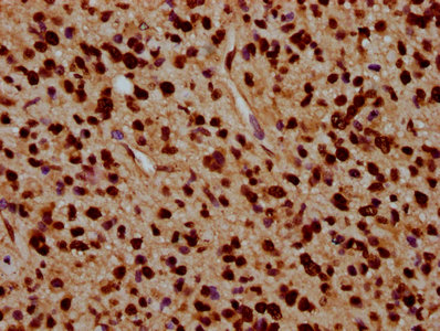 IHC image of CSB-PA010429OA91nacHU diluted at 1:5 and staining in paraffin-embedded human glioma performed on a Leica BondTM system. After dewaxing and hydration, antigen retrieval was mediated by high pressure in a citrate buffer (pH 6.0). Section was blocked with 10% normal goat serum 30min at RT. Then primary antibody (1% BSA) was incubated at 4°C overnight. The primary is detected by a biotinylated secondary antibody and visualized using an HRP conjugated SP system.