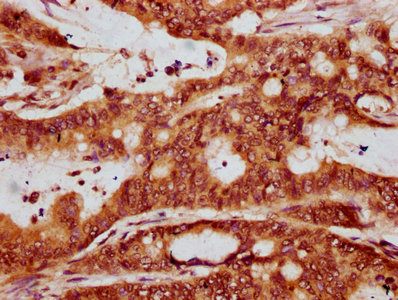 IHC image of CSB-PA010429OA91nbhbHU diluted at 1:20 and staining in paraffin-embedded human colon cancer performed on a Leica BondTM system. After dewaxing and hydration, antigen retrieval was mediated by high pressure in a citrate buffer (pH 6.0). Section was blocked with 10% normal goat serum 30min at RT. Then primary antibody (1% BSA) was incubated at 4°C overnight. The primary is detected by a biotinylated secondary antibody and visualized using an HRP conjugated SP system.