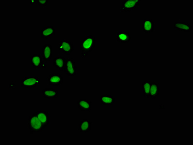 Immunofluorescence staining of Hela cells with CSB-PA010429OA01nphHU at 1:25, counter-stained with DAPI. The cells were fixed in 4% formaldehyde, permeabilized using 0.2% Triton X-100 and blocked in 10% normal Goat Serum. The cells were then incubated with the antibody overnight at 4°C. The secondary antibody was Alexa Fluor 488-congugated AffiniPure Goat Anti-Rabbit IgG(H+L).